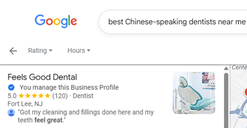 Start your search online and use keywords like “best Chinese-speaking dentists near me” or “best Chinese-speaking dentists in Fort Lee.” This allows the algorithms to identify your location so that it narrows your search based on your geographic area.